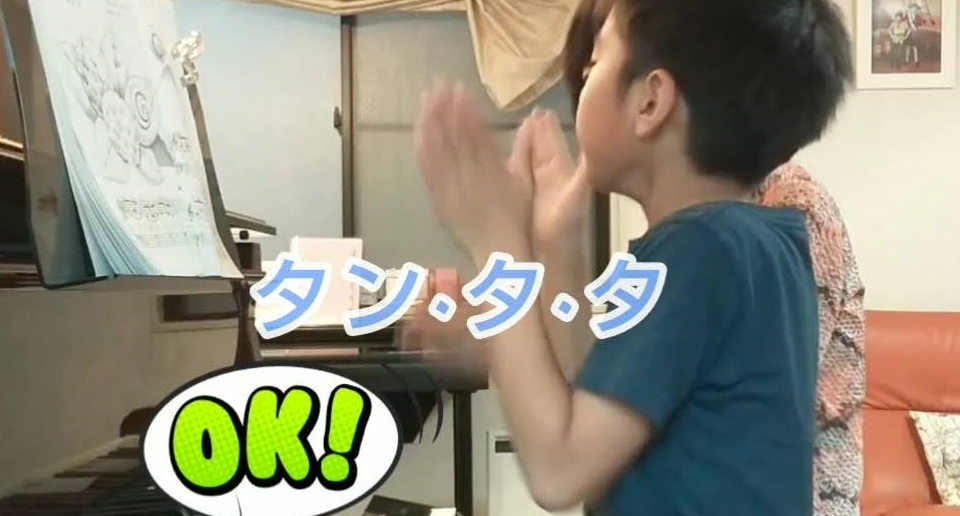 「かたつむり」のはリズムの要素が満載。「でーんでん」の右手 付点音符は知っている曲だと分かりやすいね! 左手 伴奏リズムはタタタンとタンタタの違いをリズムカードや手たたき、歌を歌って学びました。先生の説明を聞いたあと、さぁ弾くぞ!って気持ちが伝わります。